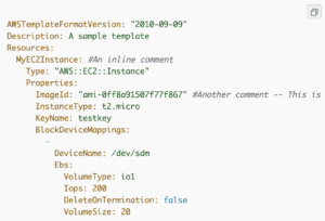 The configuration of a resource or an environment is in code, which makes the configuration consistent and less error prone. In a big team of multiple groups of developers, that makes collaboration a lot easier and more efficient. In addition, being able to version the configuration also makes the changes trackable. Please see the following snapshot as an example of a template: