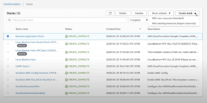 By avoiding the manual configurations, the deployment of infrastructure resources becomes significantly more scalable and repeatable. Beyond that, stacks of resources as a provisioned environment can be spun up and spun down together to serve different tasks. Please see the following snapshot of deployed stacks as an example on AWS CloudFormation.